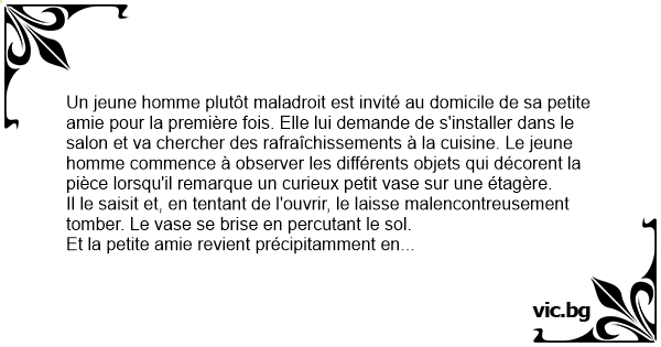 Il le saisit et, en tentant de l'ouvrir, le laisse malencontreusement tomber. Le vase se brise en percutant le sol.