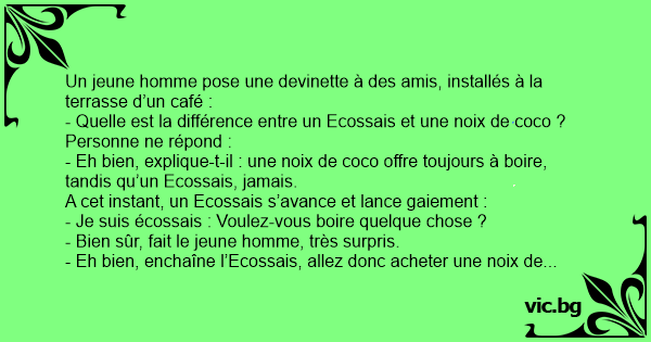 - Eh bien, explique-t-il : une noix de coco offre toujours à boire, tandis qu’un Ecossais, jamais.