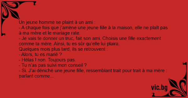 - Je vais te donner un truc, fait son ami. Choisis une fille exactement comme ta mère. Ainsi, tu es sûr qu’elle lui plaira.