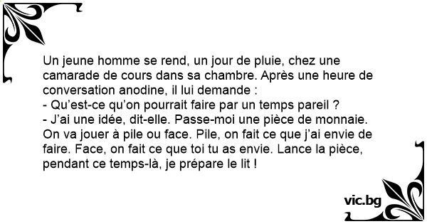 - J’ai une idée, dit-elle. Passe-moi une pièce de monnaie. On va jouer à pile ou face. Pile, on fait ce que j’ai envie de faire. Face, on fait ce que toi tu as envie. Lance la pièce, pendant ce temps-là, je prépare le lit !