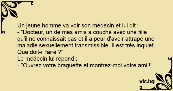 - "Docteur, un de mes amis a couché avec une fille qu'il ne connaissait pas et il a peur d'avoir attrapé une maladie sexuellement transmissible. Il est très inquiet. Que doit-il faire ?"