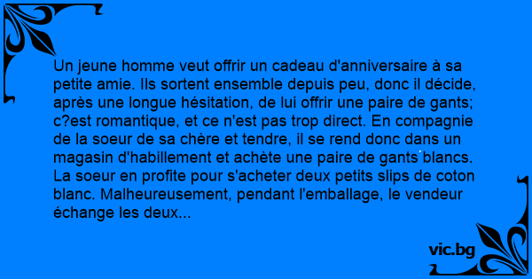 Un jeune homme veut offrir un cadeau d'anniversaire à sa petite amie. Ils sortent ensemble depuis peu, donc il décide, après une longue hésitation, de lui offrir une paire de gants; c?est romantique, et ce n'est pas trop direct. En compagnie de la soeur de sa chère et tendre, il se rend donc dans un magasin d'habillement et achète une paire de gants blancs. La soeur en profite pour s'acheter deux petits slips de coton blanc. Malheureusement, pendant l'emballage, le vendeur échange les deux paquets : La soeur se retrouve avec les gants, alors que notre jeune ami récupère les petits slips. Sans faire plus attention au contenu du paquet, le jeune homme le met dans un colis à destination de chère et tendre, accompagné de la lettre suivante :