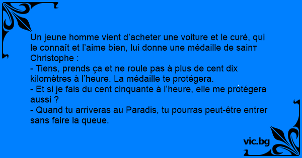 Un jeune homme vient d’acheter une voiture et le curé, qui le connaît et l’aime bien, lui donne une médaille de sаinт Christophe :
