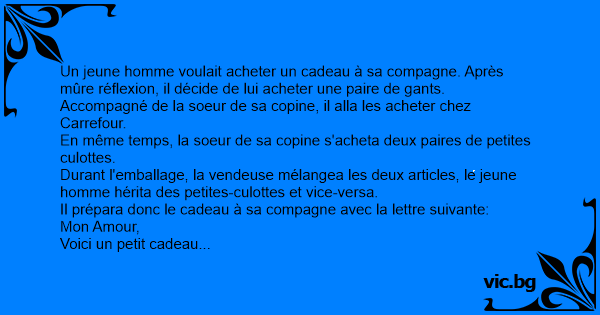 Un jeune homme voulait acheter un cadeau à sa compagne. Après mûre réflexion, il décide de lui acheter une paire de gants.