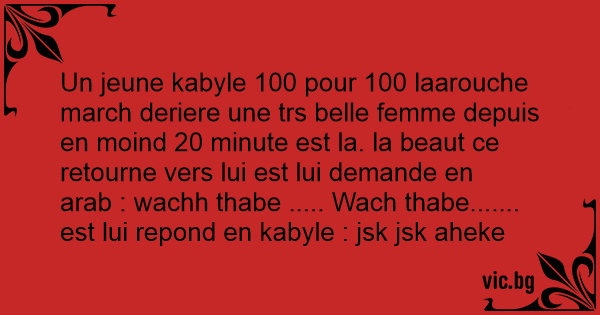 Un jeune kabyle 100 pour 100 laarouche march deriere une trs belle femme depuis en moind 20 minute est la. la beaut ce retourne vers lui est lui demande en arab : wachh thabe ..... Wach thabe....... est lui repond en kabyle : jsk jsk aheke rabi..'