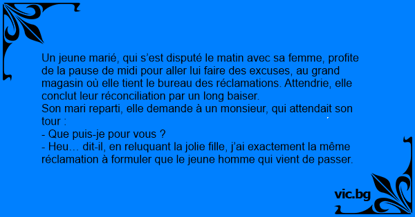 - Heu… dit-il, en reluquant la jolie fille, j’ai exactement la même réclamation à formuler que le jeune homme qui vient de passer.