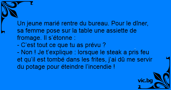 - Non ! Je t’explique : lorsque le steak a pris feu et qu’il est tombé dans les frites, j’ai dû me servir du potage pour éteindre l’incendie !