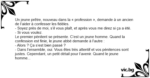 Le premier pénitent se présente. C’est un jeune homme. Quand la confession est finie, le jeune abbé demande à l’autre :
