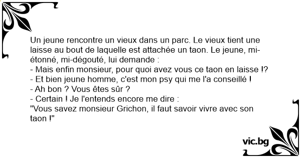 Un jeune rencontre un vieux dans un parc. Le vieux tient une laisse au bout de laquelle est attachée un taon. Le jeune, mi-étonné, mi-dégouté, lui demande :