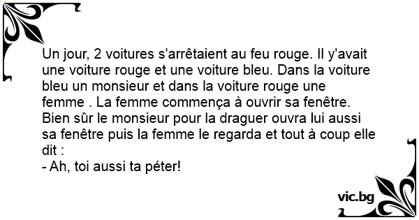 Un mec roule en voiture. Il s'arrête à un feu rouge et voit une fille blonde dans une autre voiture à côté de la sienne. La blonde le regarde en souriant. Le mec ouvre la vitre de sa voiture...