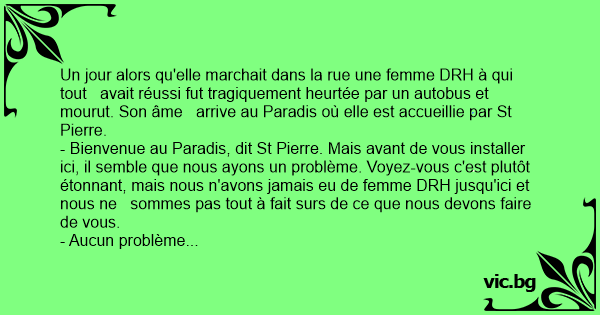 - Bienvenue au Paradis, dit St Pierre. Mais avant de vous installer ici, il semble que nous ayons un problème. Voyez-vous c'est plutôt étonnant, mais nous n'avons jamais eu de femme DRH jusqu'ici et nous ne sommes pas tout à fait surs de ce que nous devons faire de vous.
