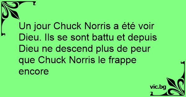 Un jour Chuck Norris a été voir Dieu. Ils se sont battu et depuis Dieu ne descend plus de peur que Chuck Norris le frappe encore