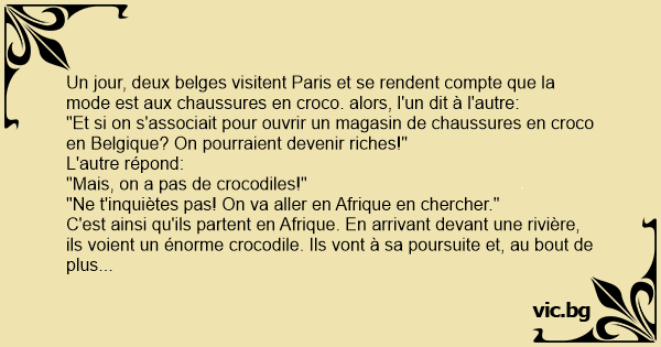 Un jour, deux belges visitent Paris et se rendent compte que la mode est aux chaussures en croco. alors, l'un dit à l'autre: