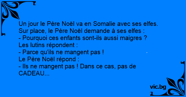 Un jour le Père Noël va en Somalie avec ses elfes. Sur place, le Père Noël demande à ses elfes :