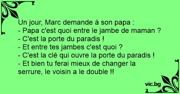 Un petit garçon pose des questions a son père : - Papa, maman elle a quoi entre ses jambes ? Le père répond : -C'est la porte du paradis mon enfant ! Le petit se demande alors : -Alors toi papa, qu'est ce que tu as entre le jambes ? Son père lui répond : -Euh ... C'est la clé qui permet d'ouvrir...