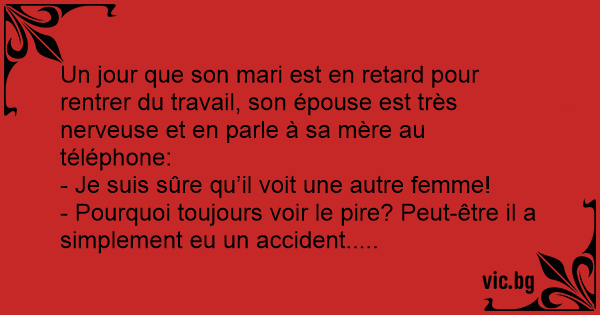 Un jour que son mari est en rетаrd pour rentrer du travail, son épouse est très nerveuse et en parle à sa mère au téléphone: