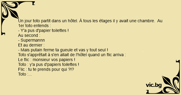 Un jour toto partit dans un hôtel. À tous les étages il y avait une chambre. Au 1er toto entends :