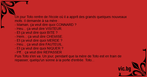 Un jour Toto rentre de l'école où il a apprit des grands quelques nouveaux mots. Il demande à sa mère :