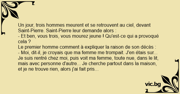 Un jour, trois hommes meurent et se retrouvent au ciel, devant Sаinт-Pierre. Sаinт-Pierre leur demande alors : - Et ben, vous trois, vous mourez jeune ! Qu'est-ce qui a provoqué cela ? Le premier homme comment à expliquer la raison de son décès : - Moi, dit-il, je croyais que ma femme me trompait. J'en étais sur... Je suis rentré chez moi, puis voit ma femme, toute nue, dans le lit, mais avec personne d'autre... Je cherche partout dans la maison, et je ne trouve rien, alors j'ai fait pris le frigo dans mes mains, tellement que j'étais fâché, je l'ai lancé dans la rue, puis soudain j'ai fait une crise cardiaque... Saint-Pierre dit alors au deuxième gars : - Et toi, comment est-tu mort ? - Moi, dit-il,je me promenais dans la rue, tranquille et heureux, et soudain, j'ai recu un frigo sur moi... Alors Sаinт-Pierre se tourne vers le troisième, et lui dit alors : - Et toi, pourquoi est-tu décédé ? Le troisième répond : - Vous allez pas le croire, mais j'étais dans un frigo, et puis soudain je suis tombé !