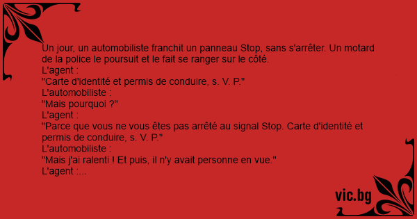"Parce que vous ne vous êtes pas arrêté au signal Stop. Carte d'identité et permis de conduire, s. V. P."