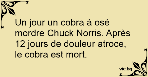 Un jour Chuck Norris s'est fait mordre par un cobra. Après plusieurs jours d'atroces souffrances, le serpent est mort.