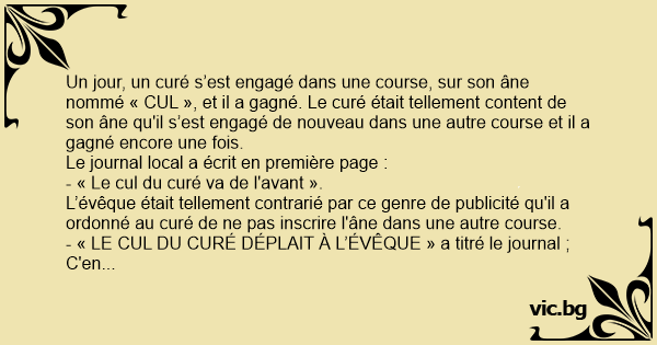 Un jour, un curé s’est engagé dans une course, sur son âne nommé « CUL », et il a gagné. Le curé était tellement content de son âne qu'il s’est engagé de nouveau dans une autre course et il a gagné encore une fois.