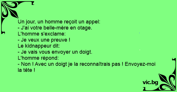 Един ден мъж получава обаждане: - Взехме свекърва ти като заложник. - Искам доказателство! - Ще ти изпратя пръст. - Неее! С пръст не бих я познал! Изпрати ми главата и!