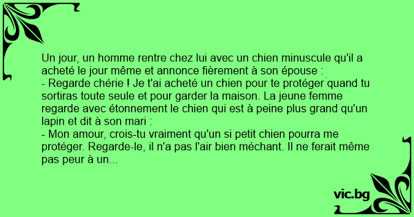- Regarde chérie ! Je t'ai acheté un chien pour te protéger quand tu sortiras toute seule et pour garder la maison. La jeune femme regarde avec étonnement le chien qui est à peine plus grand qu'un lapin et dit à son mari :