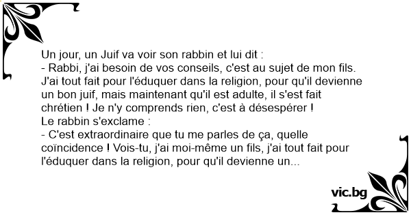 - C'est extraordinaire que tu me parles de ça, quelle coïncidence ! Vois-tu, j'ai moi-même un fils, j'ai tout fait pour l'éduquer dans la religion, pour qu'il devienne un bon juif, mais une fois adulte, il s'est dépêché de se faire chrétien ! Moi aussi, je suis désespéré, mais tu sais, dans ce genre de cas, ce n'est pas à un rabbin qu'il faut s'adresser, mais à Dieu.