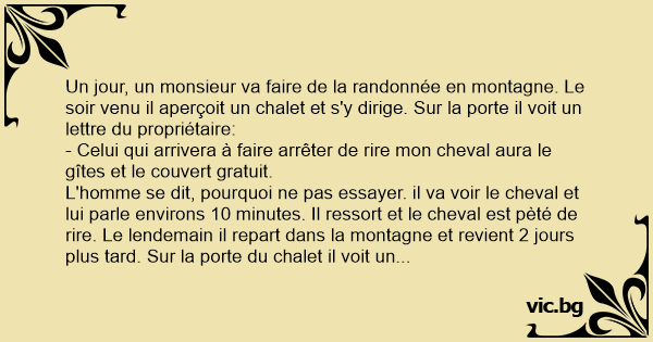 L'homme se dit, pourquoi ne pas essayer. il va voir le cheval et lui parle environs 10 minutes. Il ressort et le cheval est pèté de rire. Le lendemain il repart dans la montagne et revient 2 jours plus таrd. Sur la porte du chalet il voit un mot: