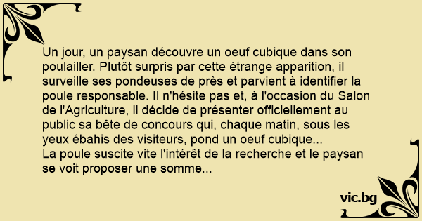 Un jour, un paysan découvre un oeuf cubique dans son poulailler. Plutôt surpris par cette étrange apparition, il surveille ses pondeuses de près et parvient à identifier la poule responsable. Il n'hésite pas et, à l'occasion du Salon de l'Agriculture, il décide de présenter officiellement au public sa bête de concours qui, chaque matin, sous les yeux ébahis des visiteurs, pond un oeuf cubique...