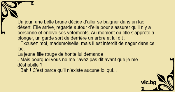 - Fröken, här är det förbjudet att bada. - Varför sa du inte det innan jag klädde av mig? - Att klä av sig är inte förbjudet.