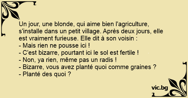 Un jour, une blonde, qui aime bien l'agriculture, s'installe dans un petit village. Après deux jours, elle est vraiment furieuse. Elle dit à son voisin :