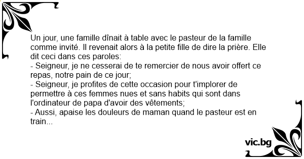 Un jour, une famille dînait à table avec le pasteur de la famille comme invité. Il revenait alors à la petite fille de dire la prière. Elle dit ceci dans ces paroles: