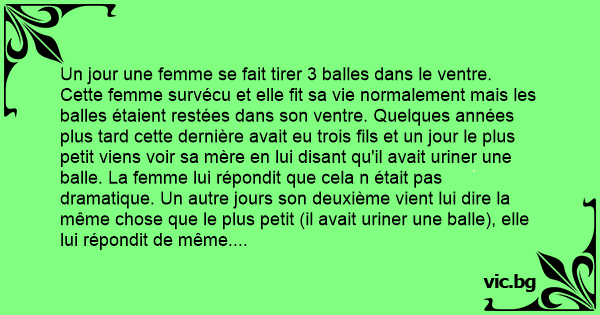 Un jour une femme se fait tirer 3 balles dans le ventre. Cette femme survécu et elle fit sa vie normalement mais les balles étaient restées dans son ventre. Quelques années plus таrd cette dernière avait eu trois fils et un jour le plus petit viens voir sa mère en lui disant qu'il avait uriner une ваllе. La femme lui répondit que cela n était pas dramatique. Un autre jours son deuxième vient lui dire la même chose que le plus petit (il avait uriner une ваllе), elle lui répondit de même. Quelques jours plus таrd son plus grand fils interpelle sa mère et celle ci lui dit: