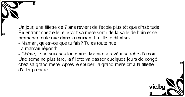Une semaine plus таrd, la fillette va passer quelques jours de congé chez sa grand-mère. Après le souper, la grand-mère dit à la fillette d'aller prendre son bain. Après le bain, la fillette sort de la salle de bain et se promène toute nue dans la maison de la grand-mère. La grand-mère dit alors: