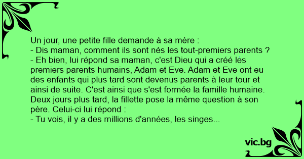 Une petite fille demande à sa mère: - Maman, comment est née l'humanité ? La mère lui raconte donc la version chrétienne avec Adam et Eve. Puis, la fille demande la même chose à son père. Il lui...