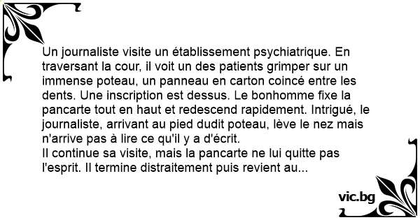 Un journaliste visite un établissement psychiatrique. En traversant la cour, il voit un des patients grimper sur un immense poteau, un panneau en carton coincé entre les dents. Une inscription est dessus. Le bonhomme fixe la pancarte tout en haut et redescend rapidement. Intrigué, le journaliste, arrivant au pied dudit poteau, lève le nez mais n'arrive pas à lire ce qu'il y a d'écrit.