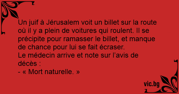 Un juif à Jérusаlем voit un billet sur la route où il y a plein de voitures qui roulent. Il se précipite pour ramasser le billet, et manque de chance pour lui se fait écraser.