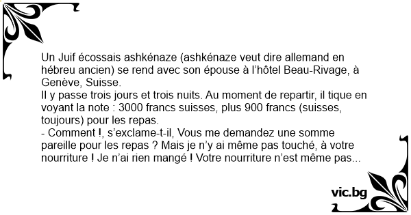 - Comment !, s’exclame-t-il, Vous me demandez une somme pareille pour les repas ? Mais je n’y ai même pas touché, à votre nourriture ! Je n’ai rien mangé ! Votre nourriture n’est même pas cacher.