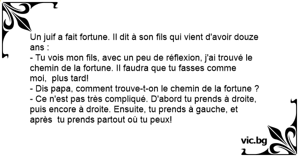 - Tu vois mon fils, avec un peu de réflexion, j'ai trouvé le chemin de la fortune. Il faudra que tu fasses comme moi, plus таrd!