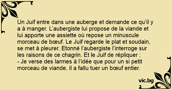 Un Juif entre dans une auberge et demande ce qu’il y a à manger. L’aubergiste lui propose de la viande et lui apporte une assiette où repose un minuscule morceau de bœuf. Le Juif regarde le plat et soudain, se met à pleurer. Etonné l’aubergiste l’interroge sur les raisons de ce chagrin. Et le Juif de répliquer :