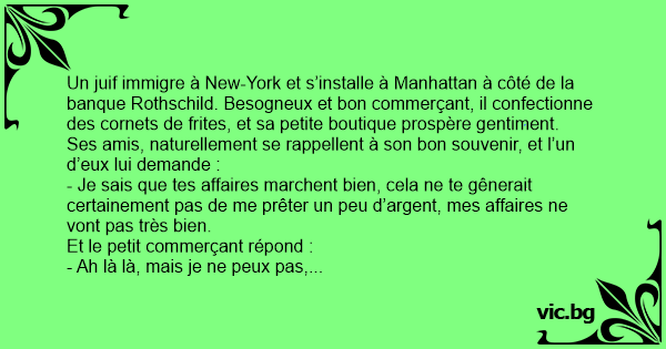 - Ah là là, mais je ne peux pas, j’aurais bien voulu mais… Vois-tu, je vais te faire une confidence, lorsque je me suis installé ici, j’ai passé un accord avec Rothschild : je ne fais pas de prêt, et eux ne vendent pas de frites.