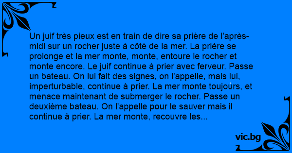 Un juif très pieux est en train de dire sa prière de l'après-midi sur un rocher juste à côté de la mer. La prière se prolonge et la mer monte, monte, entoure le rocher et monte encore. Le juif continue à prier avec ferveur. Passe un bateau. On lui fait des signes, on l'appelle, mais lui, imperturbable, continue à prier. La mer monte toujours, et menace maintenant de submerger le rocher. Passe un deuxième bateau. On l'appelle pour le sauver mais il continue à prier. La mer monte, recouvre les pieds du juif en prière. Passe un troisième bateau, mais il continue à prier. La mer atteint ses épaules, sa bouche. Il continue obstinément à prier. Puis la mer le recouvre totalement. Il arrive au Ciel d'un air indigné :