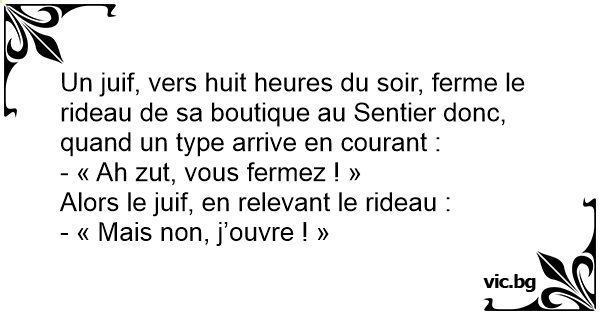 Un juif, vers huit heures du soir, ferme le rideau de sa boutique au Sentier donc, quand un type arrive en courant :