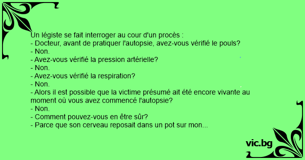 - Docteur, avant de pratiquer l'autopsie, avez-vous vérifié le pouls?