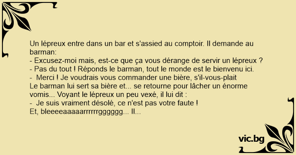 Le barman lui sert sa bière et... se retourne pour lâcher un énorme vomis... Voyant le lépreux un peu vexé, il lui dit :