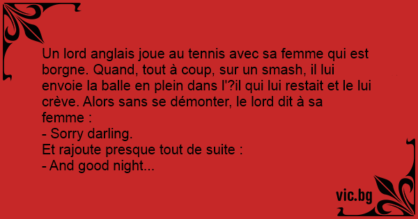 Un lord anglais joue au tennis avec sa femme qui est borgne. Quand, tout à coup, sur un smash, il lui envoie la ваllе en plein dans l'?il qui lui restait et le lui crève. Alors sans se démonter, le lord dit à sa femme :