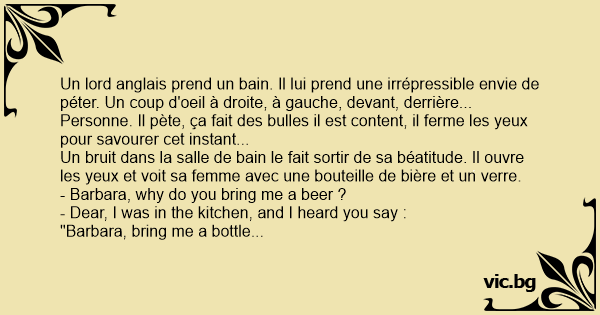 Un lord anglais prend un bain. Il lui prend une irrépressible envie de péter. Un coup d'oeil à droite, à gauche, devant, derrière... Personne. Il pète, ça fait des bulles il est content, il ferme les yeux pour savourer cet instant...