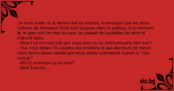 Un lundi matin où le facteur fait sa tournée, il remarque que les deux voitures de Monsieur Untel sont toujours dans le parking. à ce moment-là, le gars sort de chez lui avec un paquet de bouteilles de bière et d'alcool vides.